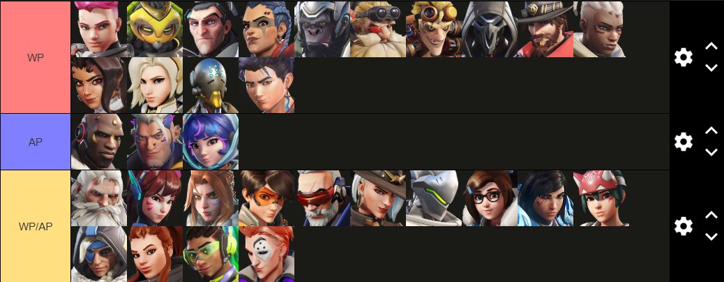 Tierリスト式にしようかと思ったけど、正直マッチングがガバすぎて、環境的には弱いキャラでもなんか知らんけどキャッシュ稼いで凄いことになってる、みたいのが割と起こるので、キャラごとに武器型(WP)が多いか、アビリティ型(AP)が多いかか、どっちも良く見るのか、で分類してコメントする方式に。