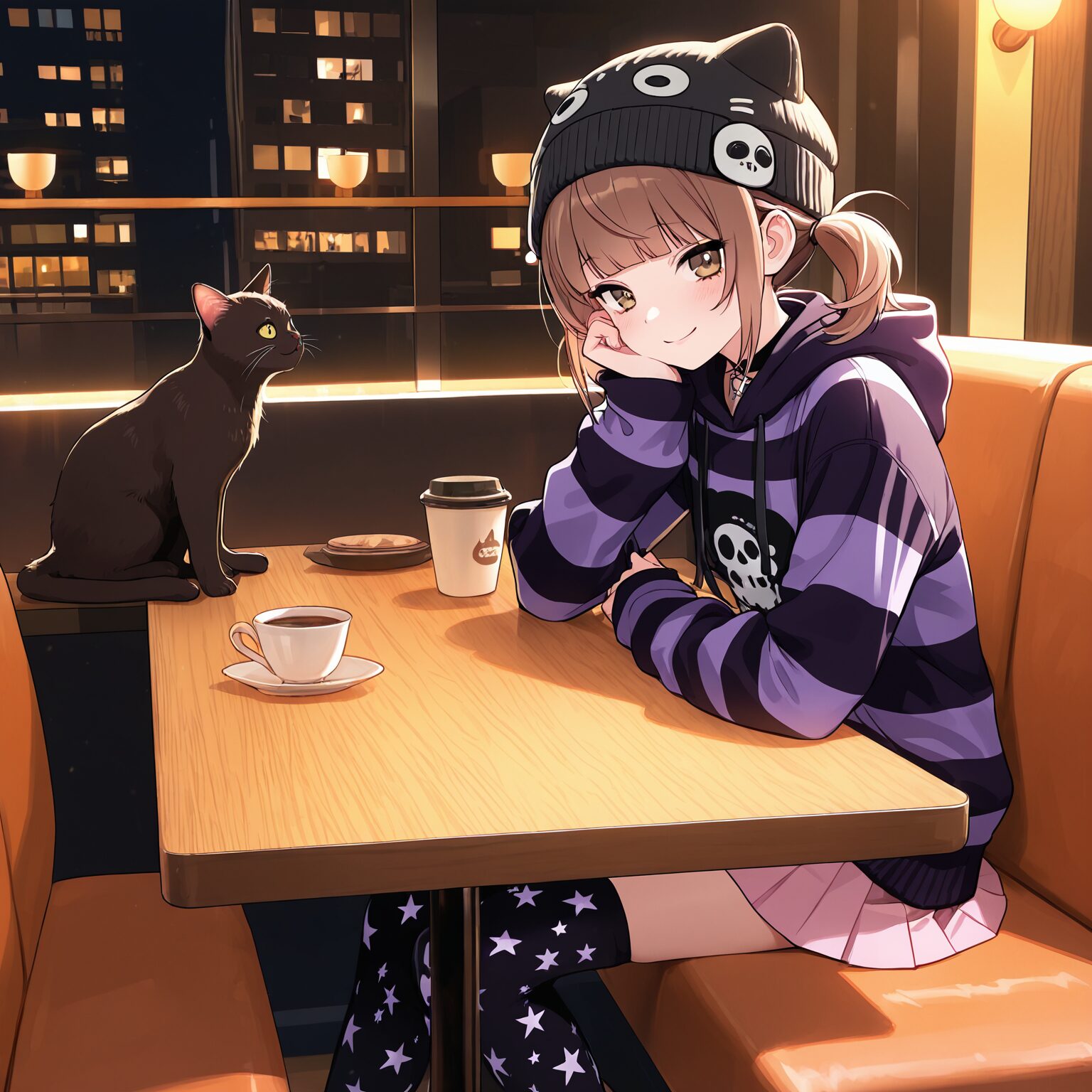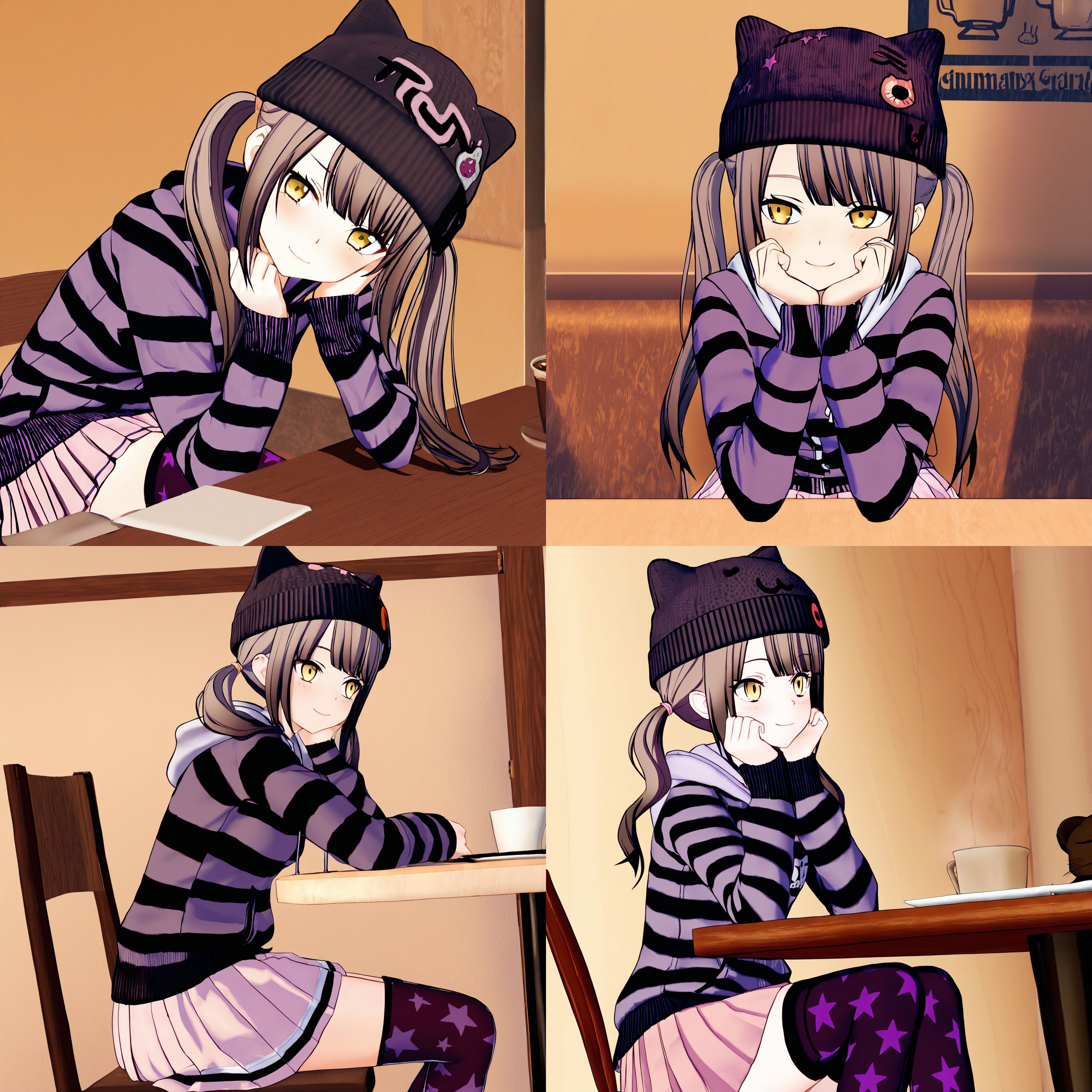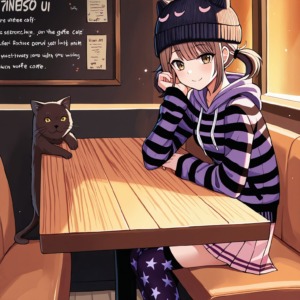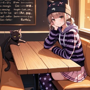 プロンプトは前回のカフェのやつを流用。ライティングもがっつり指定しているので。