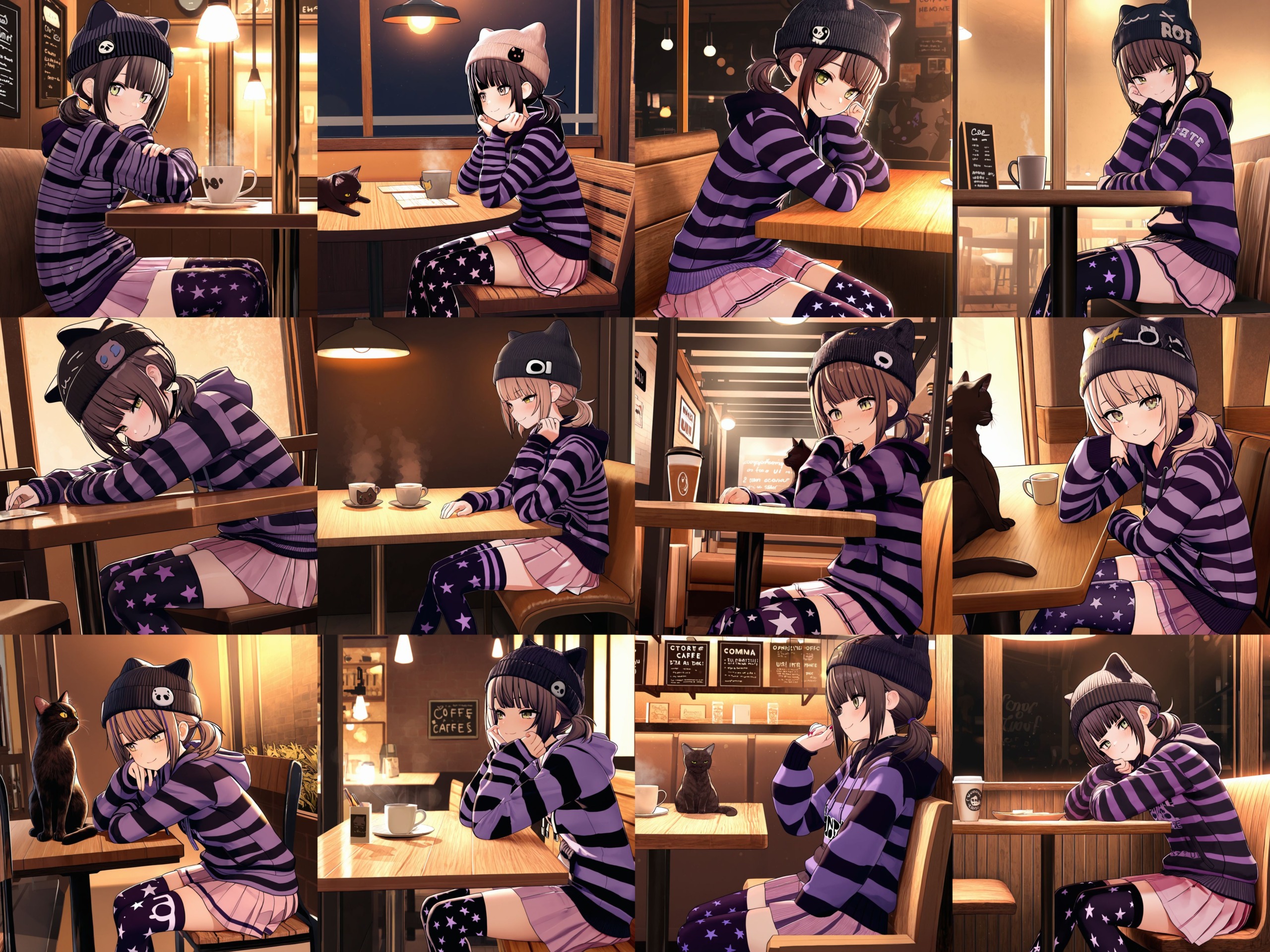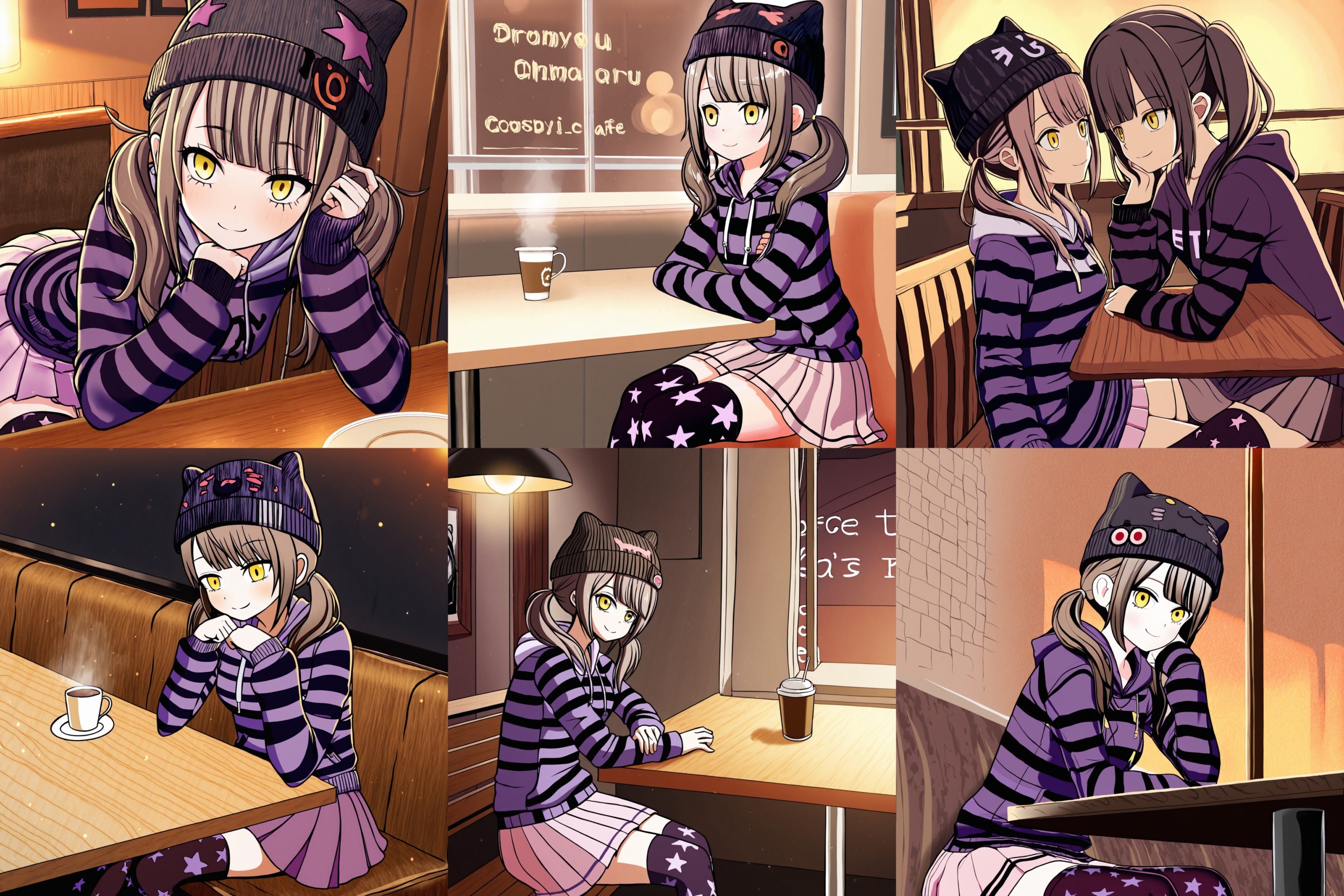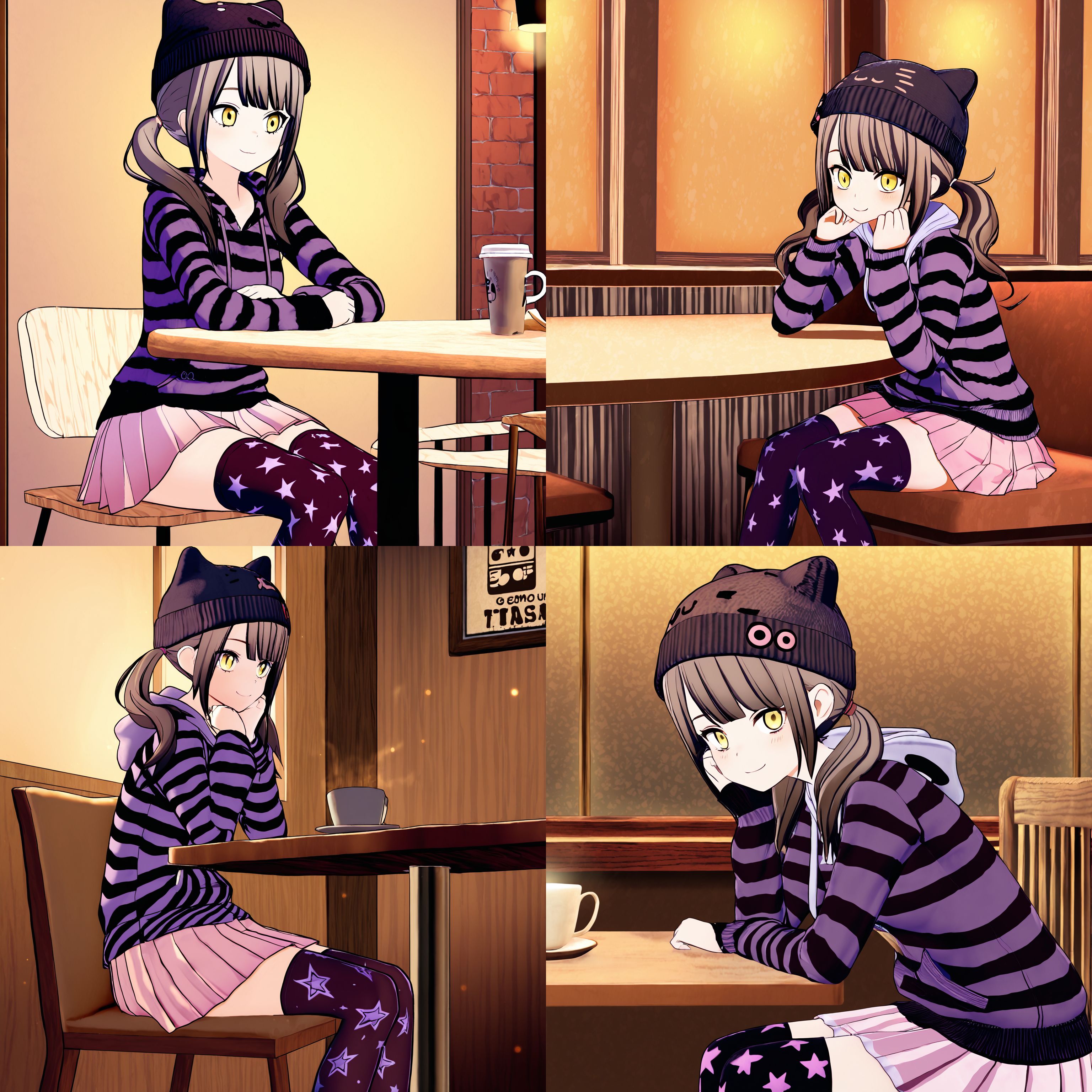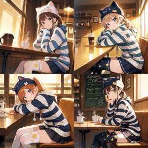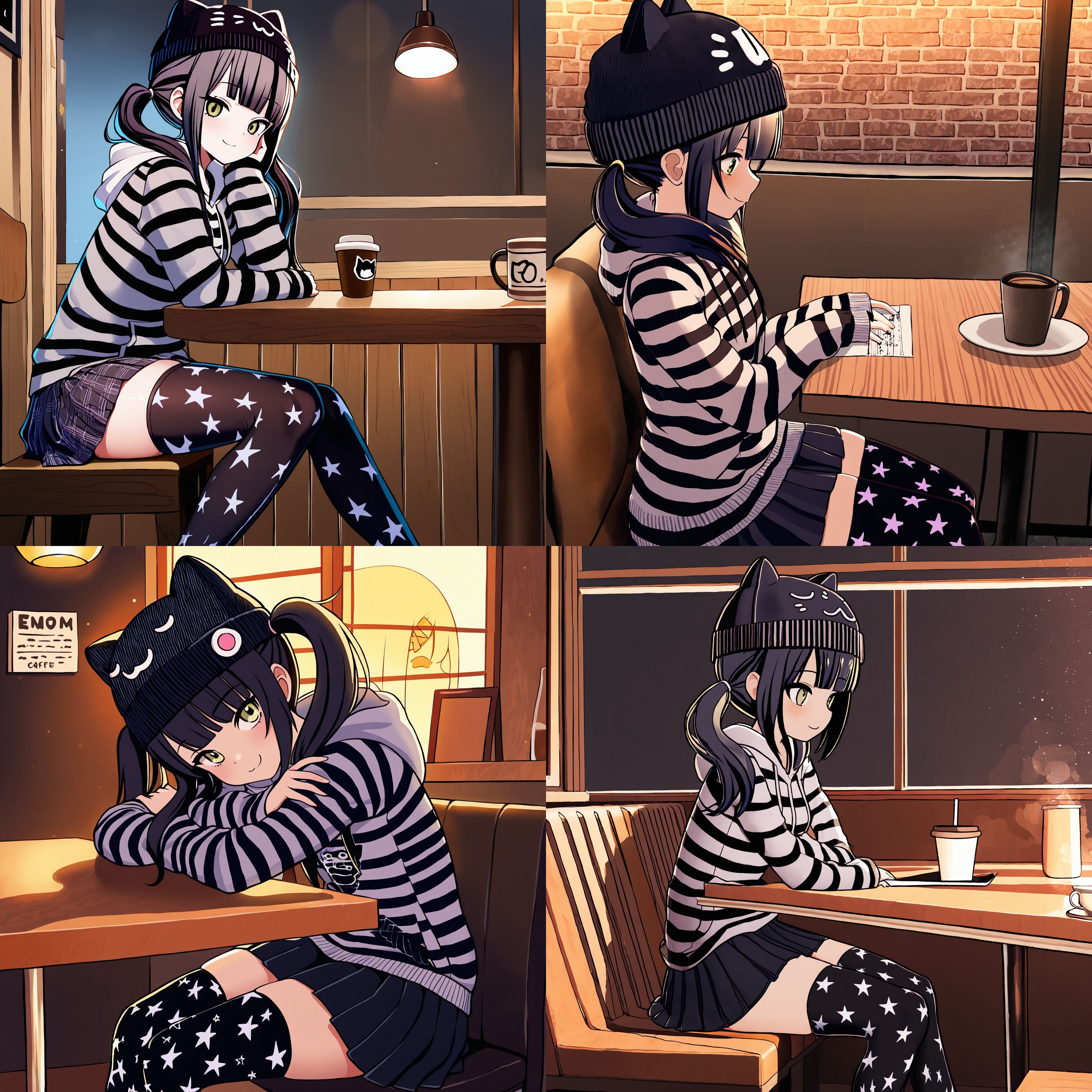 前回のカフェを、プロンプトそのまま、LoRAだけ変更して複数枚出したモノ。