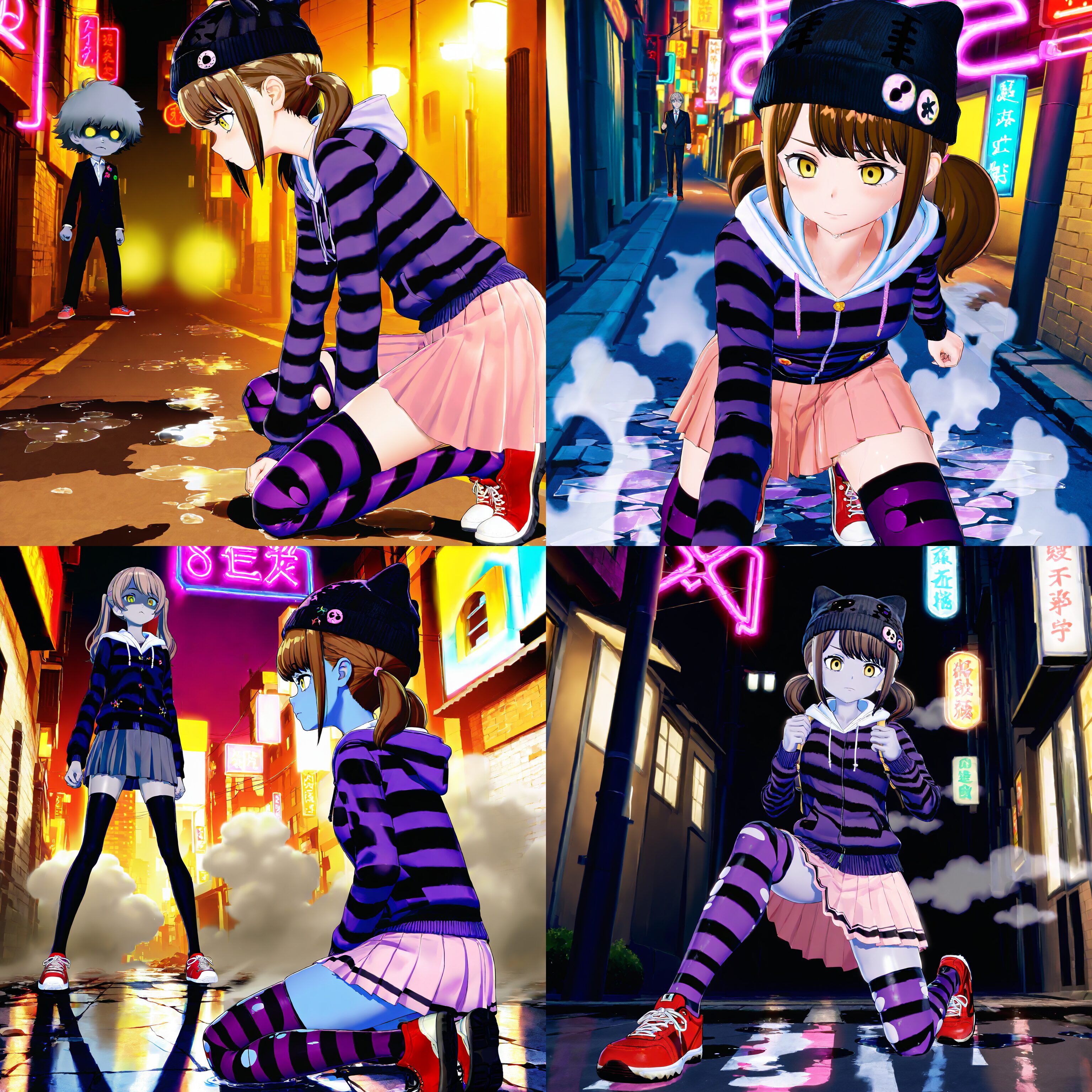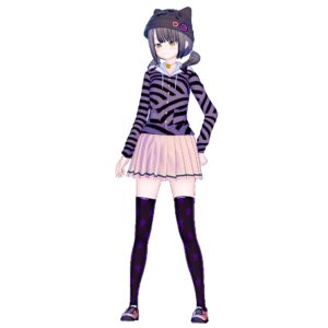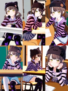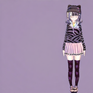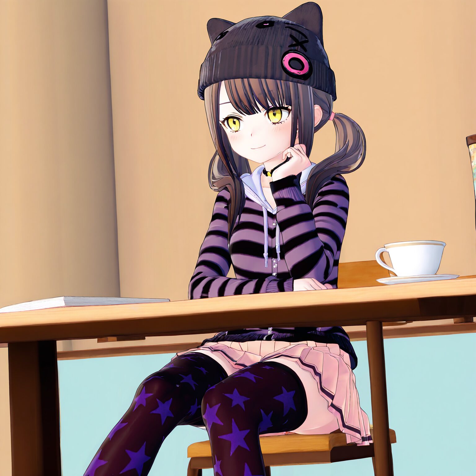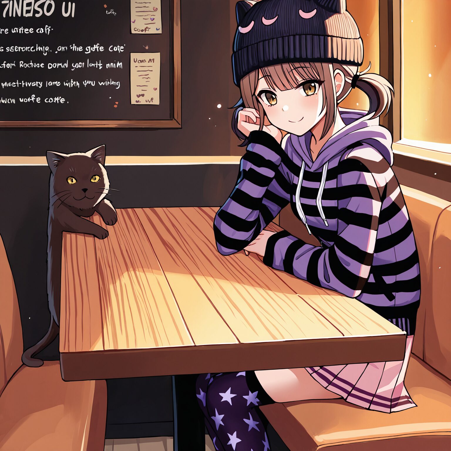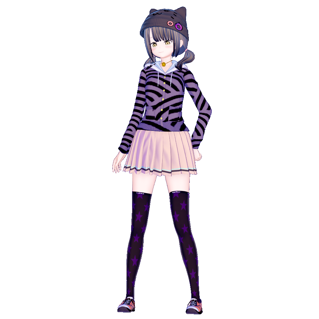 <lora指定:0.6>, トリガータグ, twintails, cat Beanie, striped hoodie, pleats skirt, star print thighhighs,