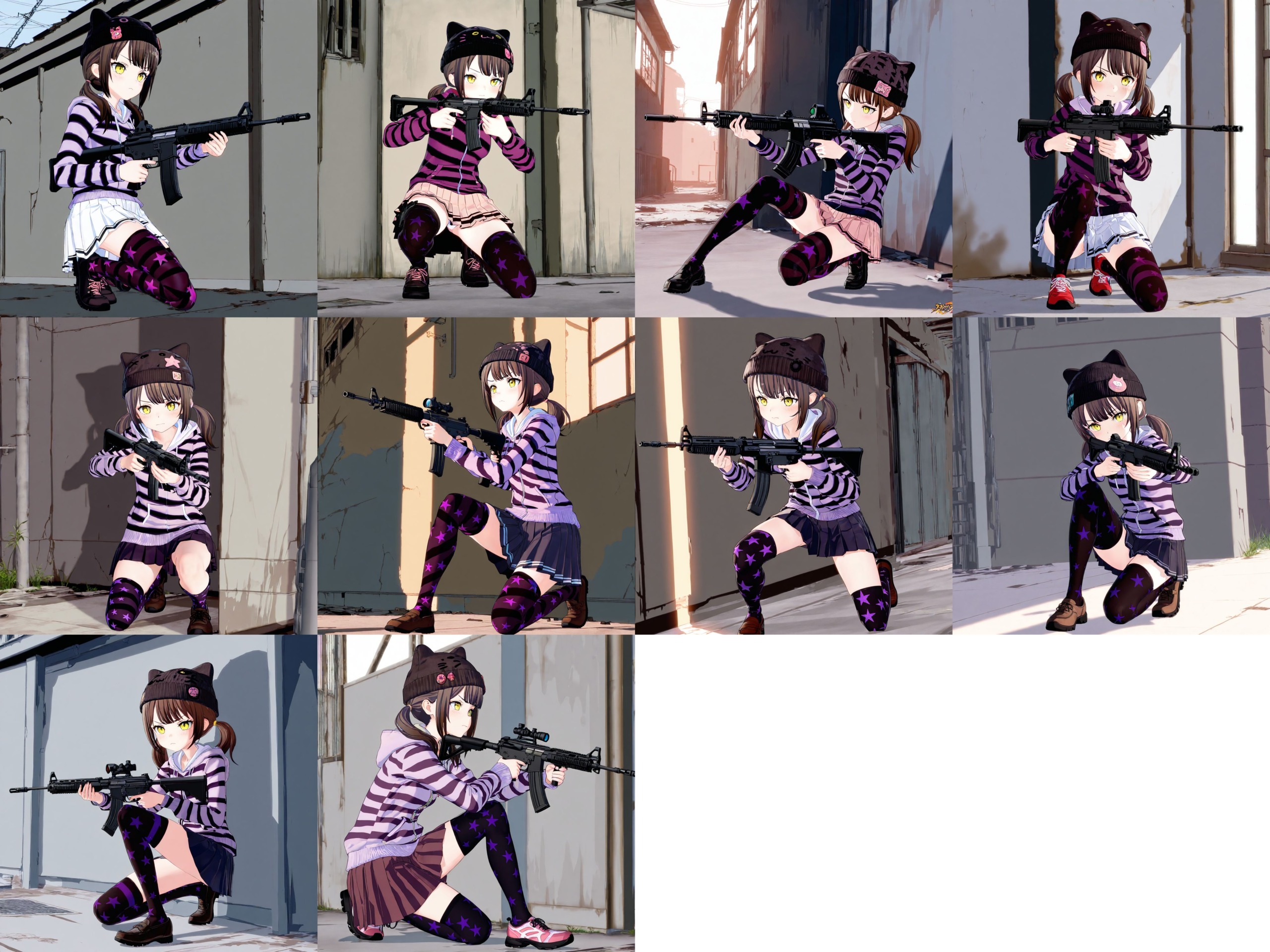 (low quality, worst quality:1.4), lowres, blurry, deformed, bad anatomy, extra limbs, missing fingers, malformed, distorted face, duplicate, clone, zombie girl, undead girl, infected girl, monster girl, glowing eyes on girl, pale skin on girl, scars on girl, damaged skin on girl, same outfit repetition, missing zombies, empty scene, incorrect gun design, broken weapon, overexposed, oversaturated, too strong muzzle flash, harsh lighting, flat contrast, 3d render, realistic human, photo style, sketch, cartoonish, text, logo, signature, watermark, jpeg artifacts, nsfw, grainy texture