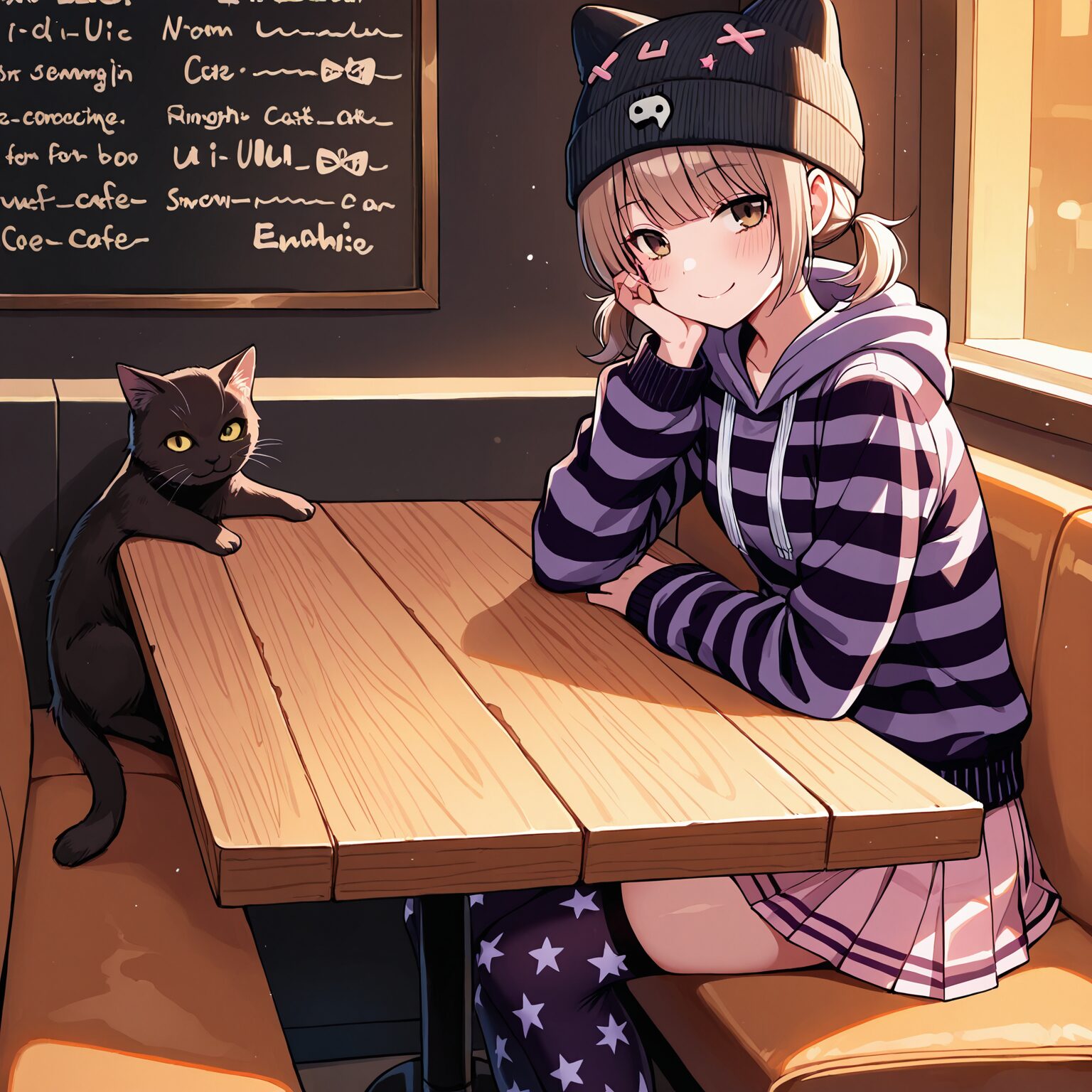 上記を付けつつ、カフェでゆったりプロンプトを最小限構成で出力。