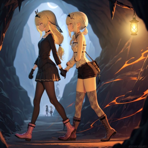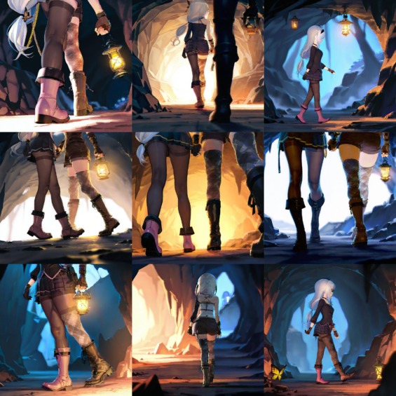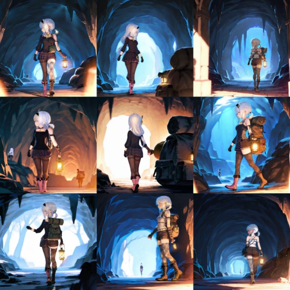 指示を日本語で書くと「洞窟の中で二人で手をつないで歩く。片方は光ったランタンとラックサックを所持。二人とも右を向く」という感じ。