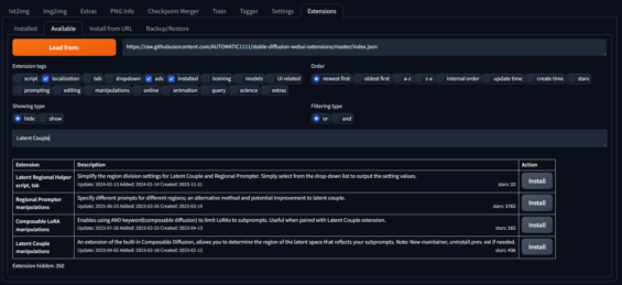色々出てくるので中段のshowing typeの↓にある空欄に「Latent Couple」と入れて検索し、出てきたLatent Coupleの右側にあるインストールボタンを押す。