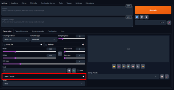 SettingタブのReload UIか、WebUIを再起動してtxt2imgの下の方にLatent Coupleが追加されてればインストール成功。