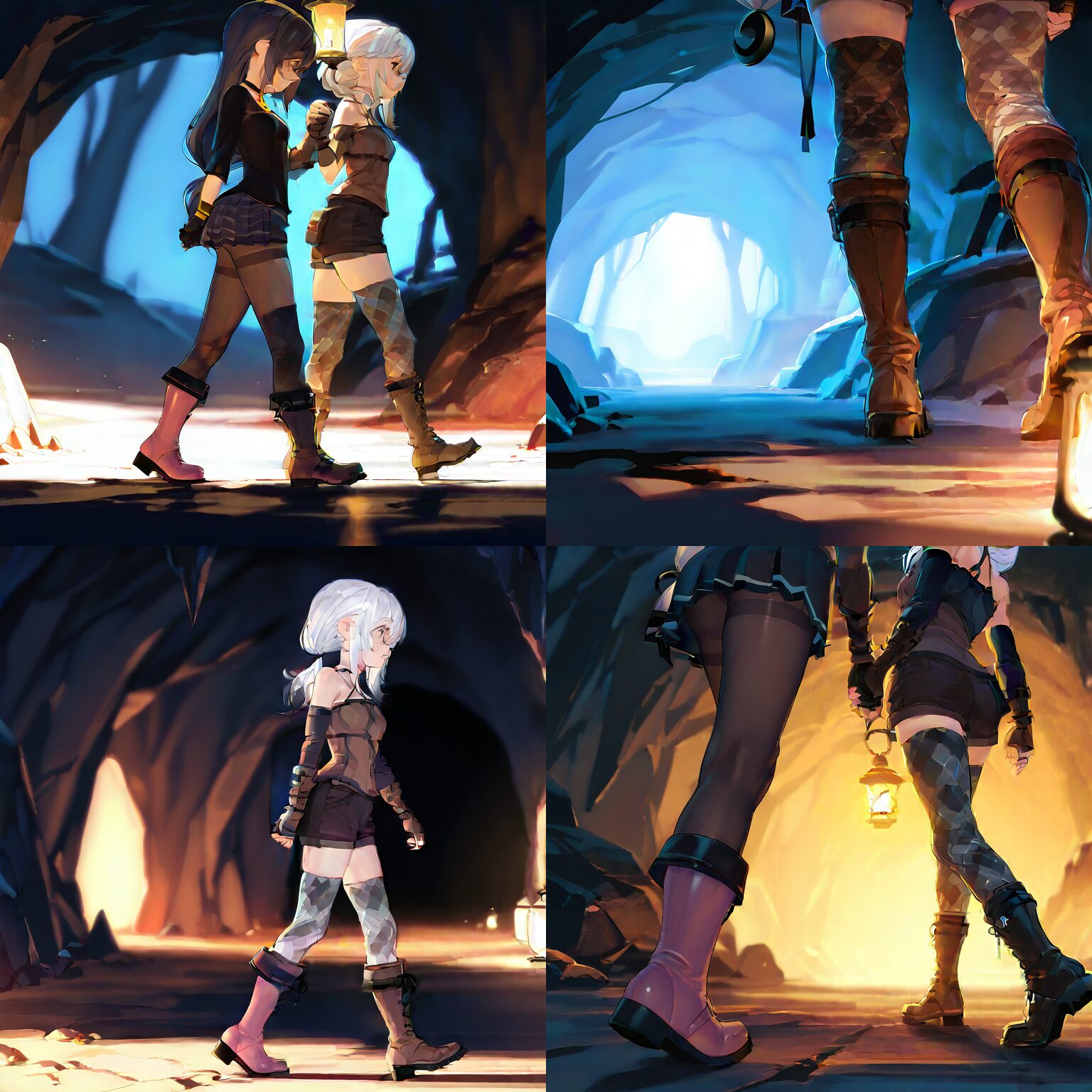 指示を日本語で書くと「洞窟の中で二人で手をつないで歩く。片方は光ったランタンとラックサックを所持。二人とも右を向く」という感じ。