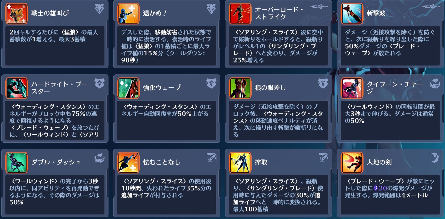 機動力・火力を補える戦士の雄叫びがマストパワーで、怯むことなし・搾取で耐久を補完し、4パワー目にダブルダッシュやハードライトブースター、強化ウェーブを取って立ち回りを強化する、というのが一番多いビルドの模様。